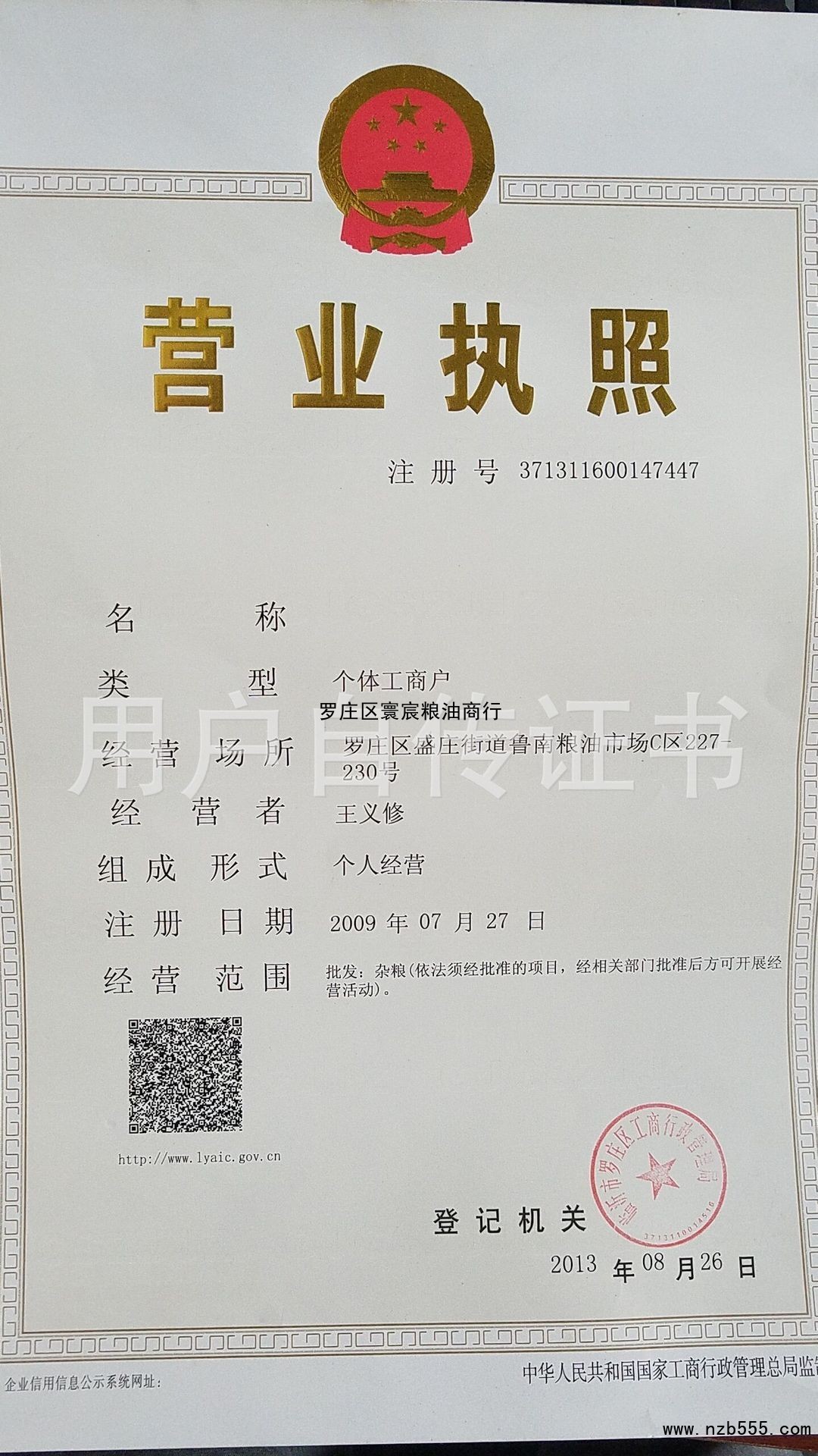 | 發(fā)證機(jī)構(gòu): | 臨沂市羅莊區(qū)工商行政管理局 | 發(fā)證時間 : | 2013-08-26 |