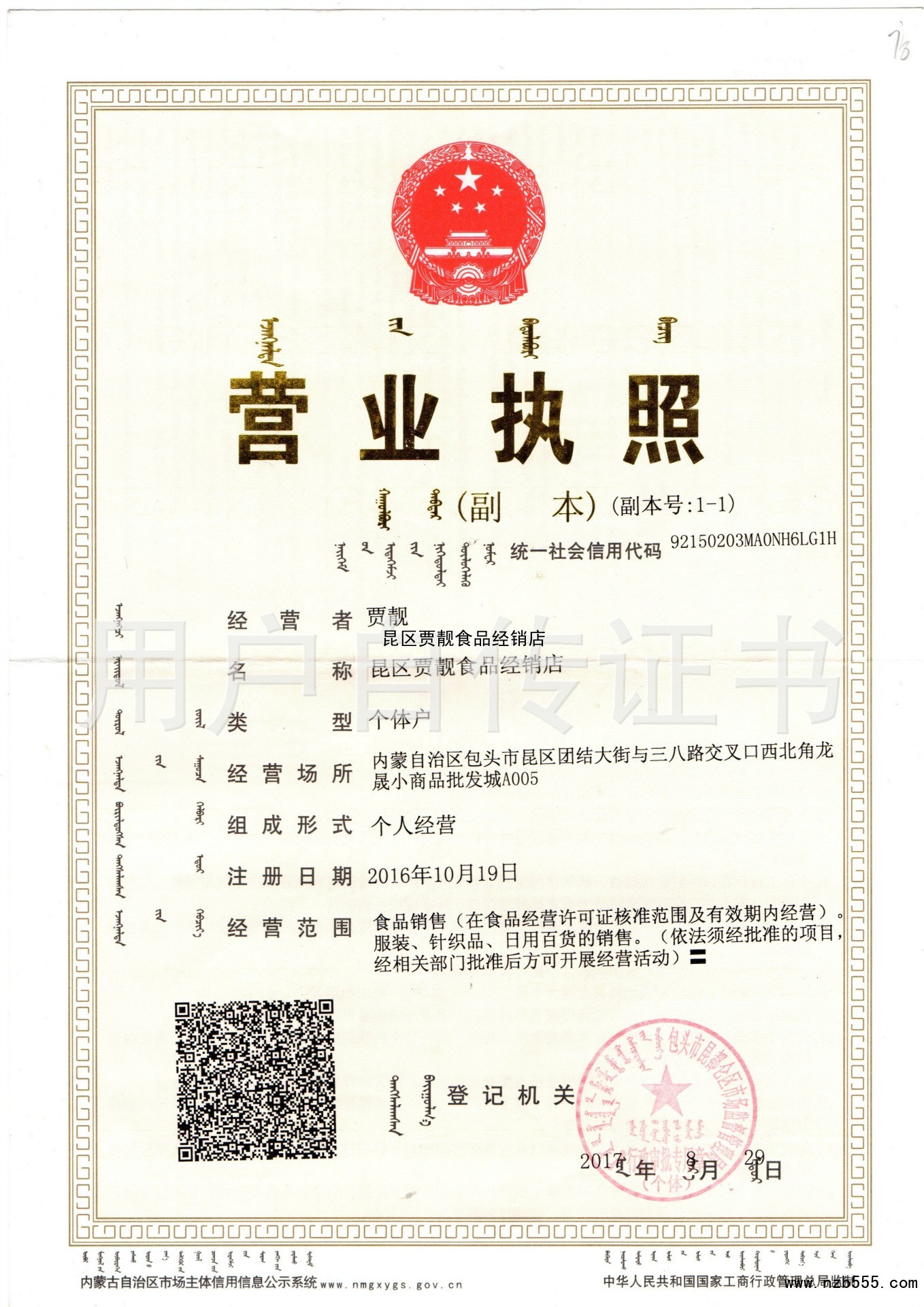 | 發(fā)證機(jī)構(gòu): | 包頭市昆都侖區(qū)市場監(jiān)督管理局 | 發(fā)證時間 : | 2017-08-29 |