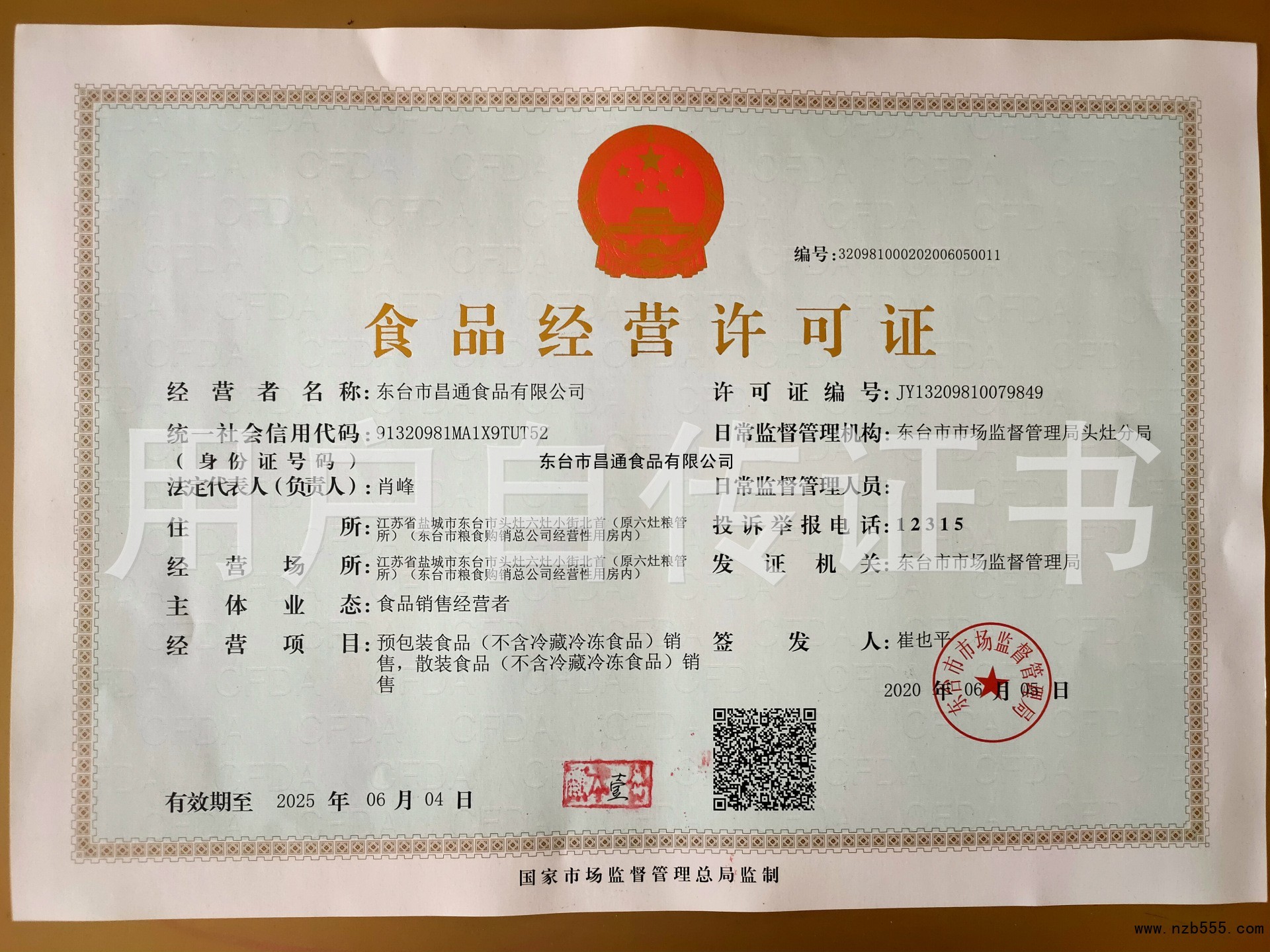 | 發(fā)證機(jī)構(gòu): | 東臺市市場監(jiān)督管理局 | 發(fā)證時間 : | 2020-06-05 |