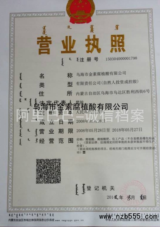 | 發(fā)證機(jī)構(gòu): | 烏海市工商行政管理局烏達(dá)分局 | 發(fā)證時(shí)間 : | 2014-04-02 |