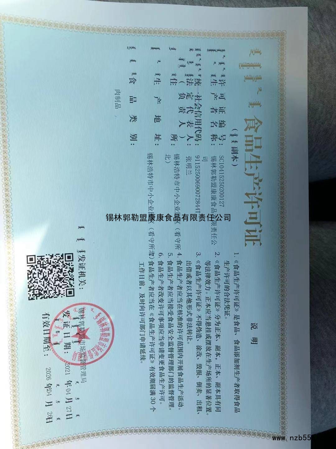 | 發(fā)證機(jī)構(gòu): | 錫林郭勒盟市場(chǎng)監(jiān)督管理局 | 發(fā)證時(shí)間 : | 2021-04-27 |