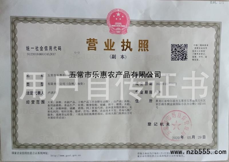 | 發(fā)證機(jī)構(gòu): | 五常市市場(chǎng)監(jiān)督管理局 | 發(fā)證時(shí)間 : | 2020-05-29 |