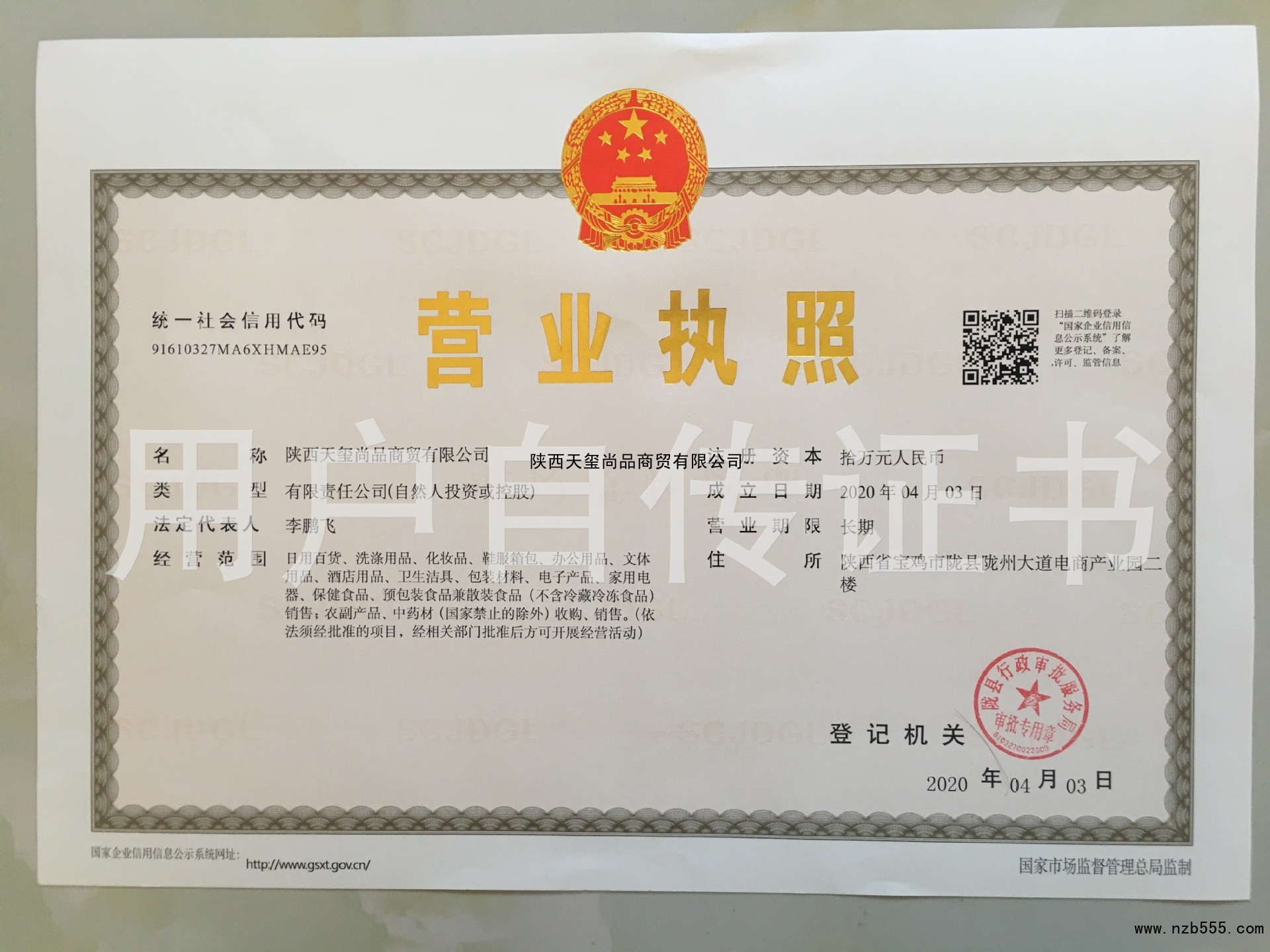 | 發(fā)證機(jī)構(gòu): | 隴縣行政審批服務(wù)局 | 發(fā)證時(shí)間 : | 2020-04-03 |