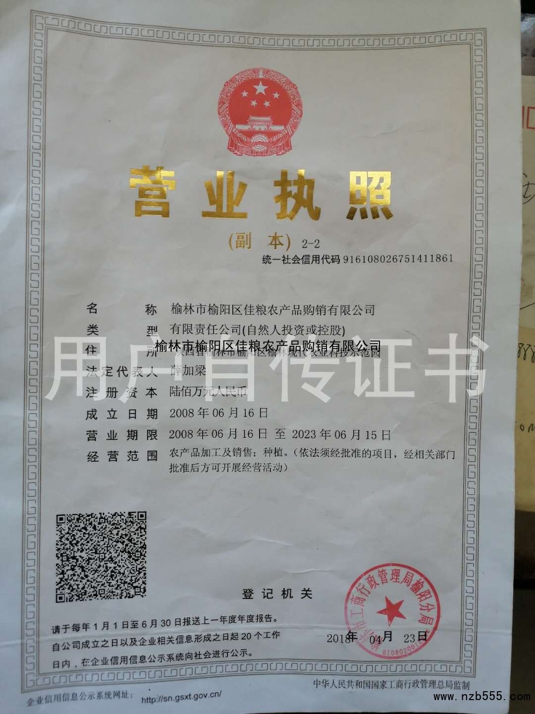 | 發(fā)證機(jī)構(gòu): | 榆林市工商行政管理局榆陽(yáng)分局 | 發(fā)證時(shí)間 : | 2018-04-23 |