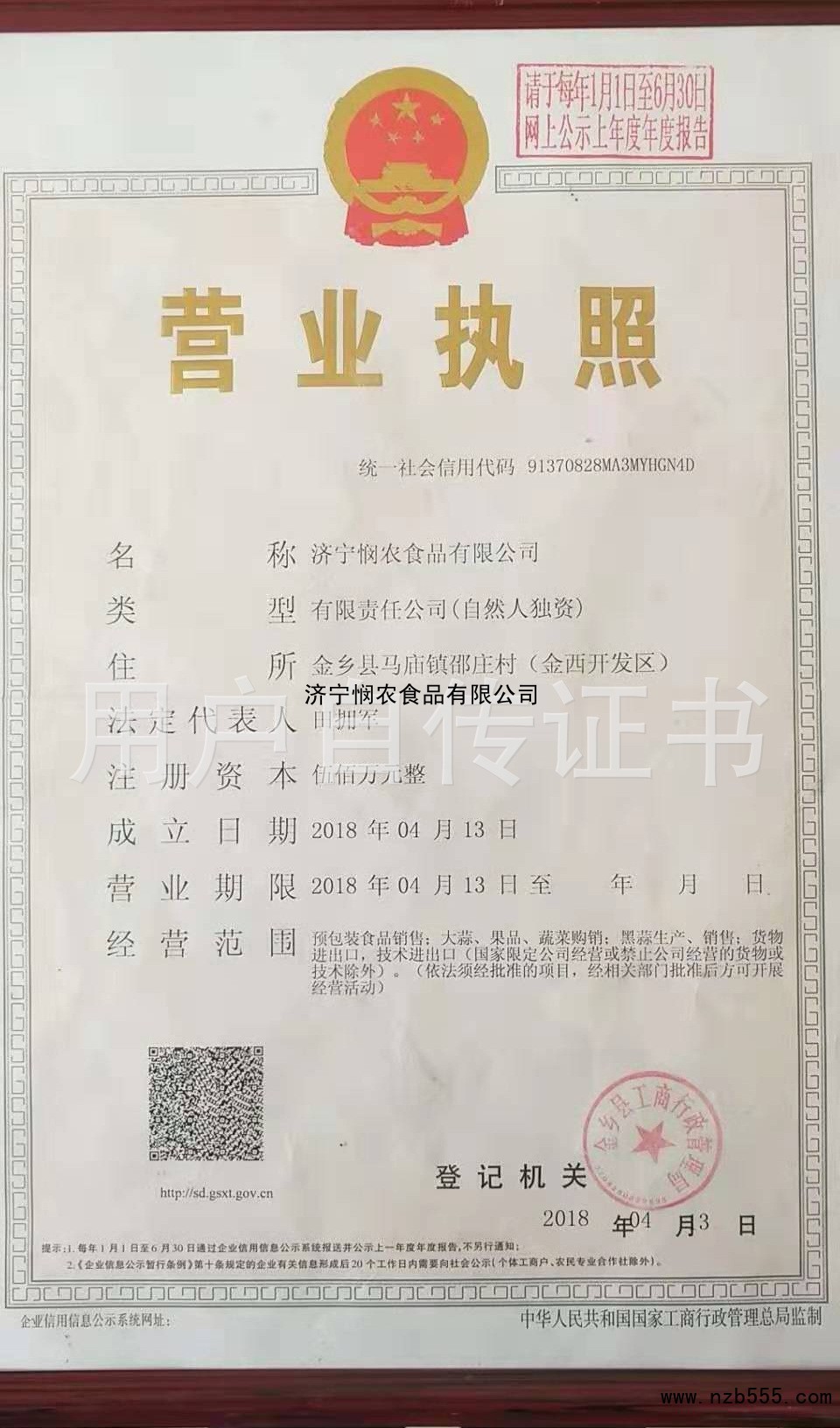 | 發(fā)證機(jī)構(gòu): | 金鄉(xiāng)縣工商行政管理局 | 發(fā)證時(shí)間 : | 2018-04-03 |