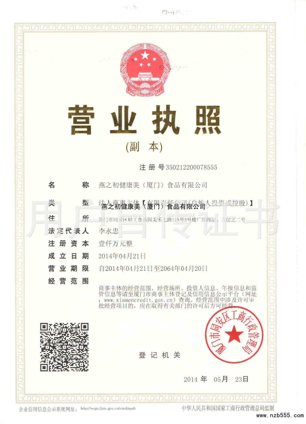 | 發(fā)證機(jī)構(gòu): | 廈門市同安區(qū)工商行政管理局 | 發(fā)證時(shí)間 : | 2014-05-23 |