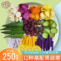 本產品為12種水果蔬菜混合250克綜合果蔬脆片。裝箱數32袋/箱,外箱尺寸51cm-39cm-26cm,重量9.2公斤,整件拿貨發貨更安全。